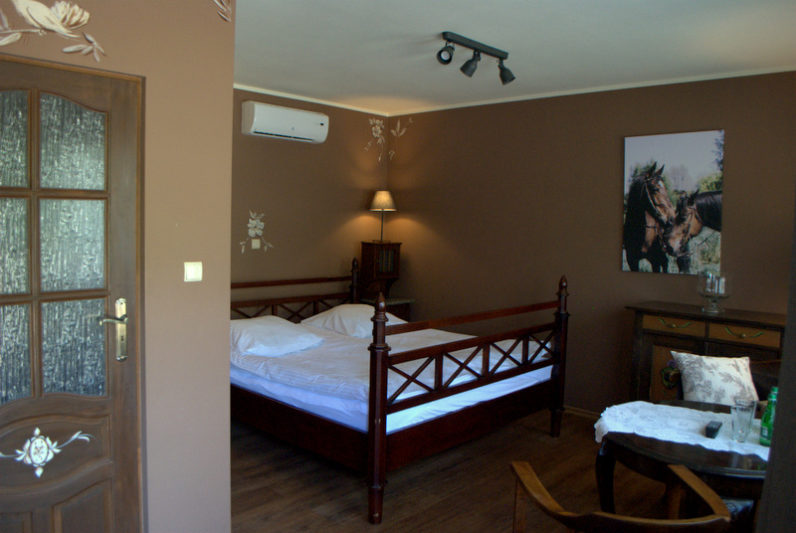 Apartament 2-os. z łazienką (ok. 35 m2) jest tylko jeden i jest największym pokojem o najwyższym standardzie. Jedno wspólne łózko 2-os. lub dwa osobne łóżka 1-os. – możliwość wyboru ustawienia, część wypoczynkowa – kanapa, dwa fotele, stolik kawowy, TV. Znajduje się na piętrze, z wejściem ze wspólnego hallu z aneksem wypoczynkowym i balkonem. Apartament posiada duże okna i balkon z przepięknym widokiem na staw, pastwiska dla koni i otaczające lasy, a dodatkowo wyjątkowy nastrój nadają mu ręcznie wykonane malunki o charakterze wiejskim. W pokoju istnieje możliwość przygotowania dodatkowego łóżka (pełnowymiarowego), a nawet dwóch dodatkowych łóżek, bądź łóżeczka dla dziecka.