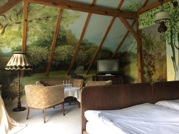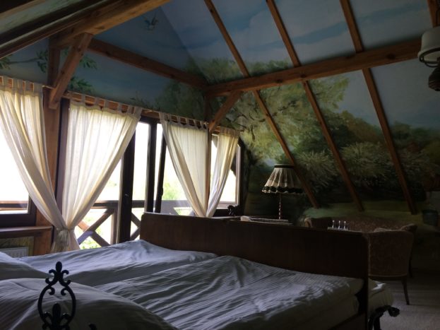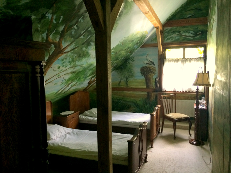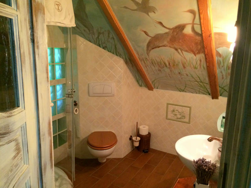 Pokoje 2-os. z łazienkami (ok. 15 m2), osobne łóżka 1-os., brak TV. Pokoje znajdują się na piętrze z wejściami ze wspólnego hallu z aneksem wypoczynkowym i balkonem. Wyjątkowy nastrój nadają im ręcznie wykonane malunki o charakterze wiejskim.